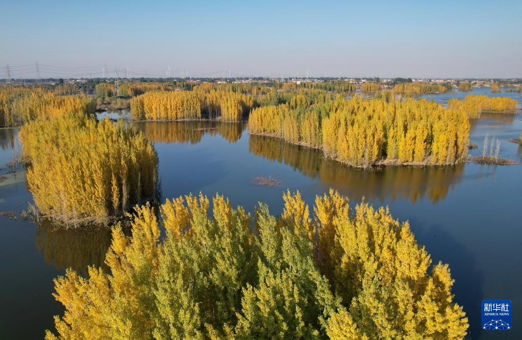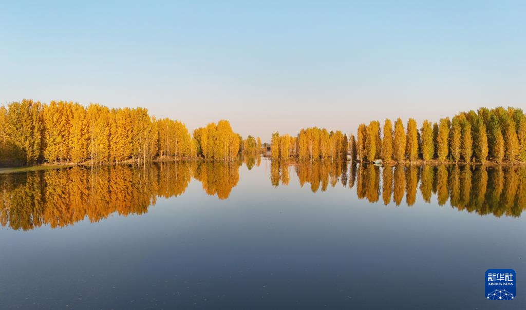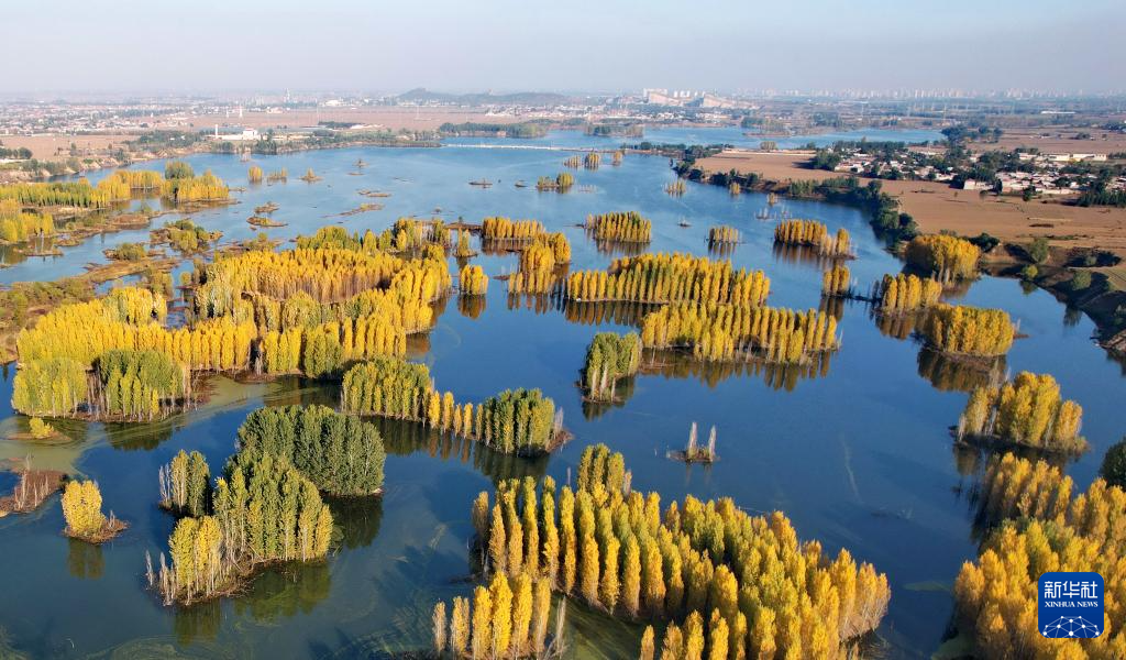 初冬时节,在河北省邢台市隆尧县亦城村泜河沿岸,树叶金黄,与水面、河岸相映衬,勾勒出一幅美丽和谐的自然画卷。
