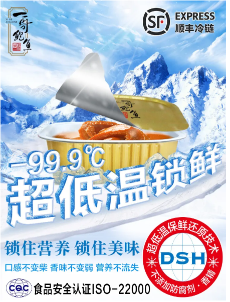 一哥鲍鱼,与市面上很多即食鲍鱼不同在于,它是“ 非罐头鲍”,通过“超低温保鲜还原DSH技术”实现全程保鲜: