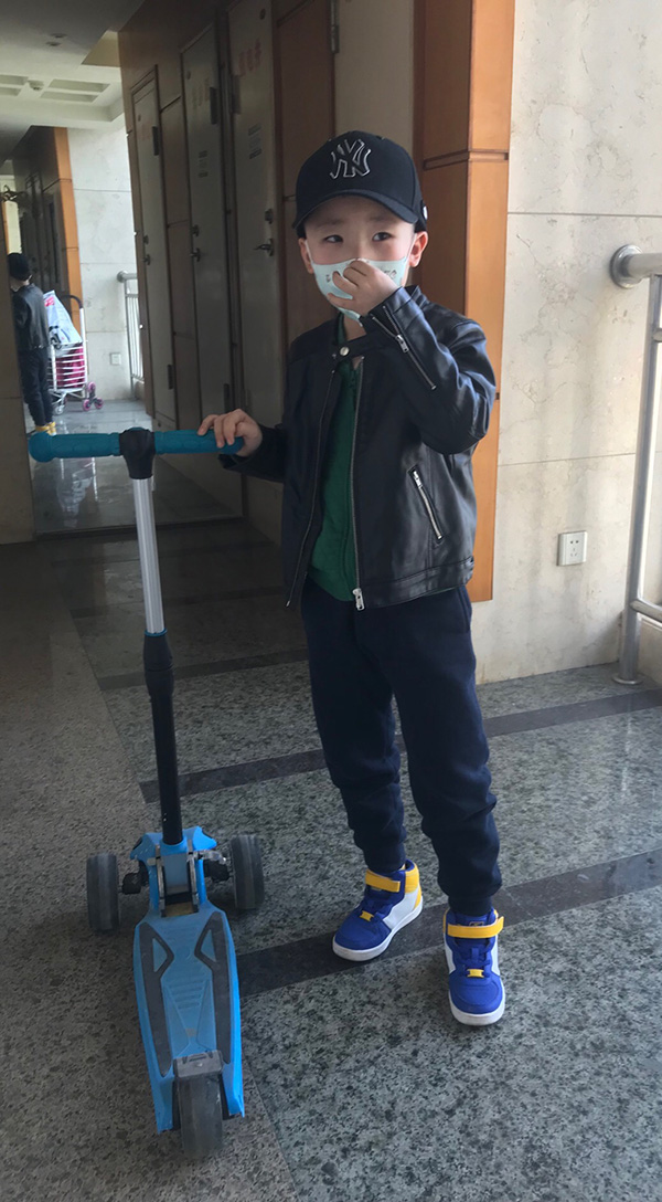 3月18日下午,程翔带儿子可乐下楼转一圈,可乐戴上口罩和帽子,还不忘带上滑板车,早早在电梯门口等待。这是封城第56天,可乐被“关”第81天。