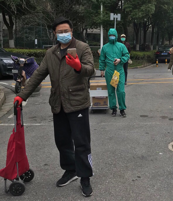 3月4日,程翔在社区做了一天的志愿者,为邻居发放团购食品。这是封城第42天。
