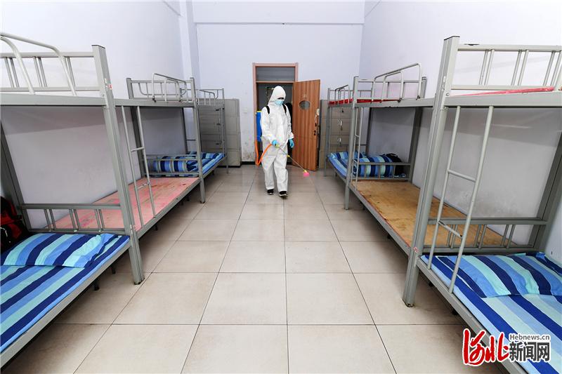 2020年4月10日,河北省怀来县沙城中学工作人员在对校园环境进行消杀作业。