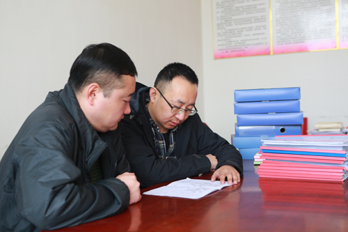 张子成(右)与驻村工作队成员一起研究最新扶贫政策(张小广)。