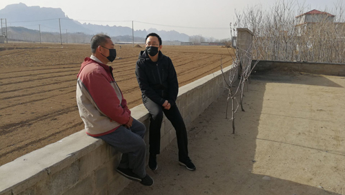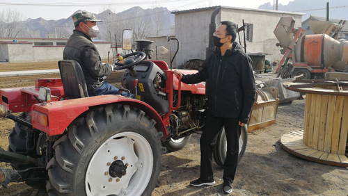 疫情期间,张子成(右)与耕耘机手商量春耕事宜(张宏伟)
