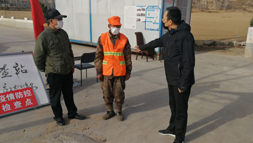 张子成(右一)与村民一起在村口站岗执勤,为出入村民测温登记(张宏伟)。