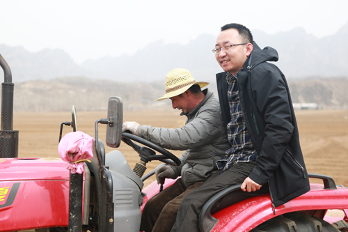 驾驶着新买的耕耘机,张子成(右)与机手开始了春播春种(张小广)。