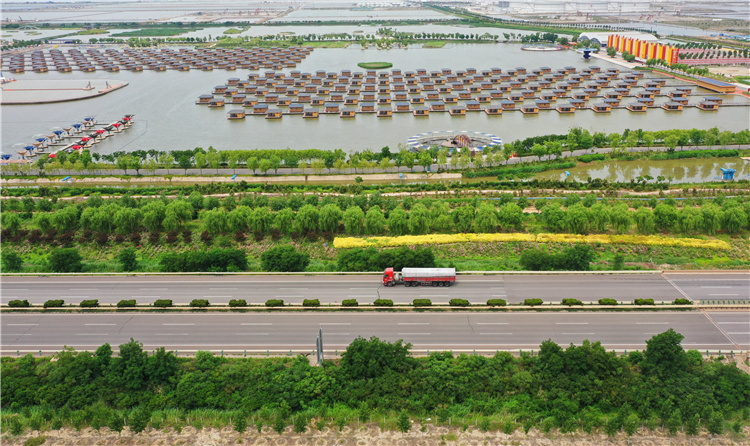这是6月28日拍摄的唐山至曹妃甸生态廊道(无人机照片)。 近日,河北省唐山市唐山至曹妃甸生态廊道工程全线竣工。该生态廊道主要位于承唐高速及唐曹高速沿线,总长度约70公里,工程在整体风貌把握上充分尊重现状林、村庄、鱼塘、稻田、湿地等生态本底条件,因地制宜设计,成为一道亮丽的风景线。新华社记者 牟宇 摄