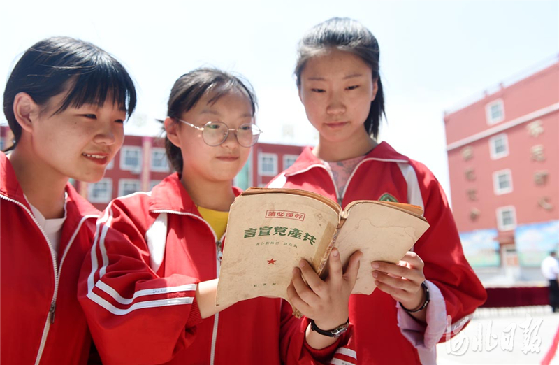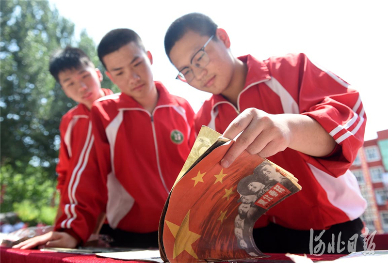 2020年7月1日,河北省宁晋县第五中学学生在翻阅红色画报。河北日报记者 赵永辉摄影报道