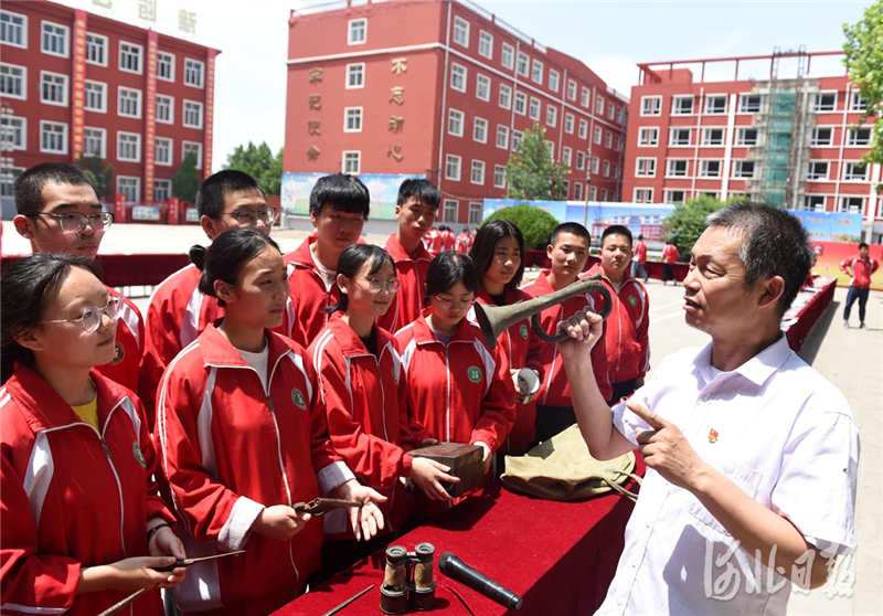 2020年7月1日,河北省宁晋县第五中学教师在为学生介绍抗战时期一把军号的故事。当日,宁晋县举办庆“七一”红色文物展,共展出不同历史时期的实物、书籍、图片等710多件,重温革命历史,传承红色基因。河北日报记者 赵永辉摄影报道
