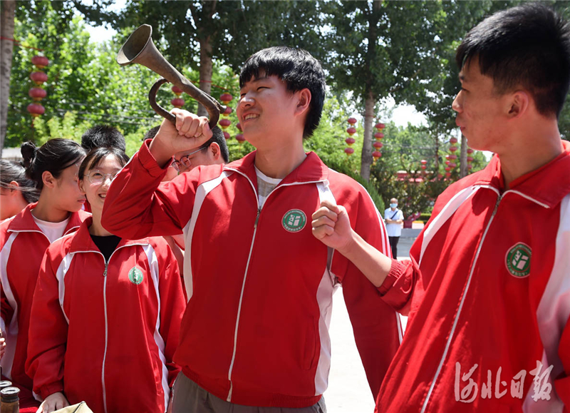 2020年7月1日,河北省宁晋县第五中学学生为一把抗战时期的军号所吸引。河北日报记者 赵永辉摄影报道