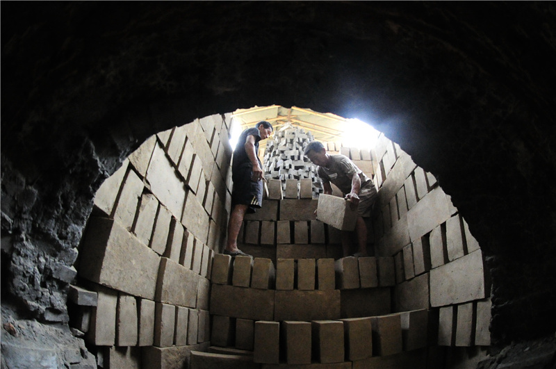7月30日,河北省任丘市出岸镇古建砖厂工人将砖坯装窑以备烧制。