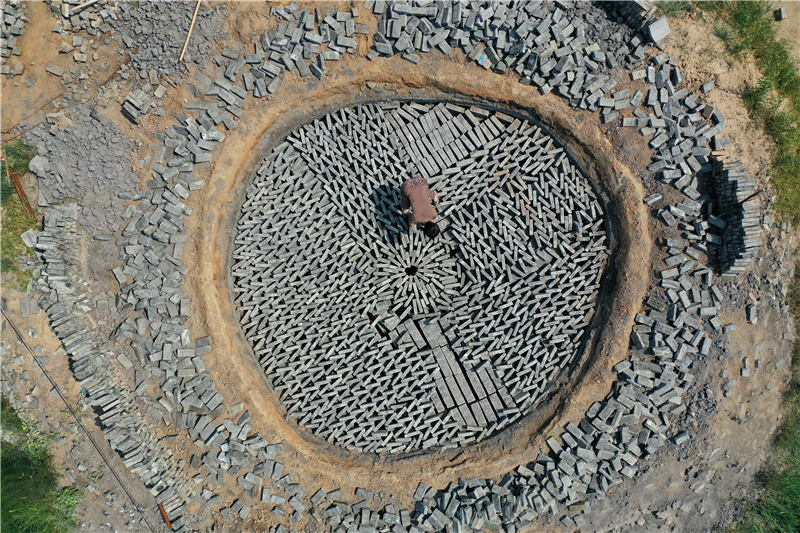 7月30日,河北省任丘市出岸镇古建砖厂工人在整理出窑的青砖(无人机照片)。