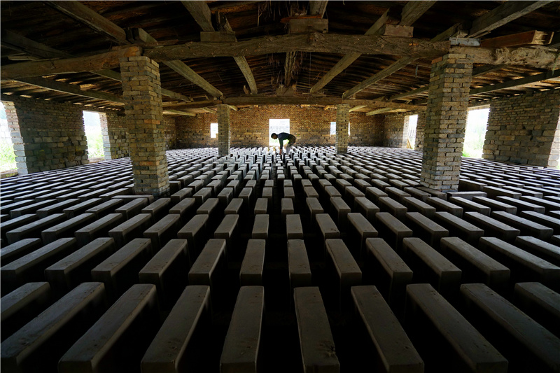 7月30日,河北省任丘市出岸镇古建砖厂工人在检验砖坯。