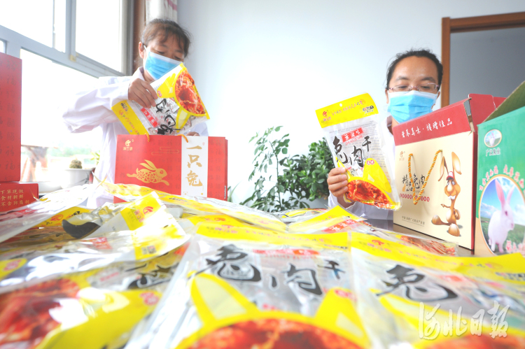 近日,河北省涿鹿县广义兔业双创产业园区员工在将兔肉食品装箱。