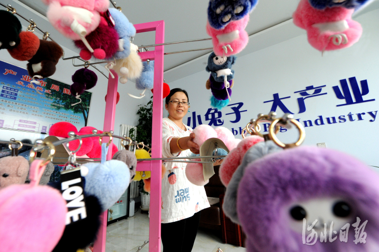 近日,河北省涿鹿县广义兔业双创产业园区员工整理兔毛加工产品。