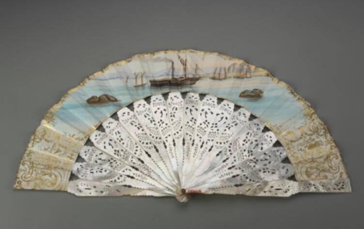 图为展品:彩绘西洋情侣蒸汽船图贝壳骨折扇