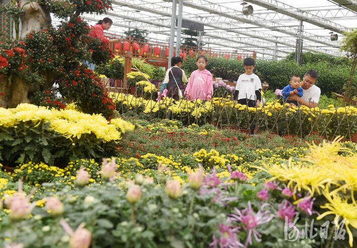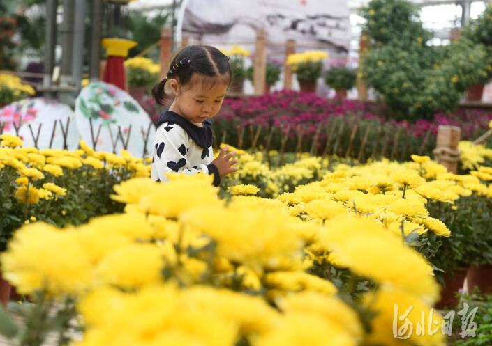 10月2日,小朋友在河北省邢台市南和区贾宋镇观赏菊花。国庆假期,邢台市南和区举办金秋菊展,30余种40万株菊花吸引了众多游客前来观赏。 河北日报记者赵永辉摄
