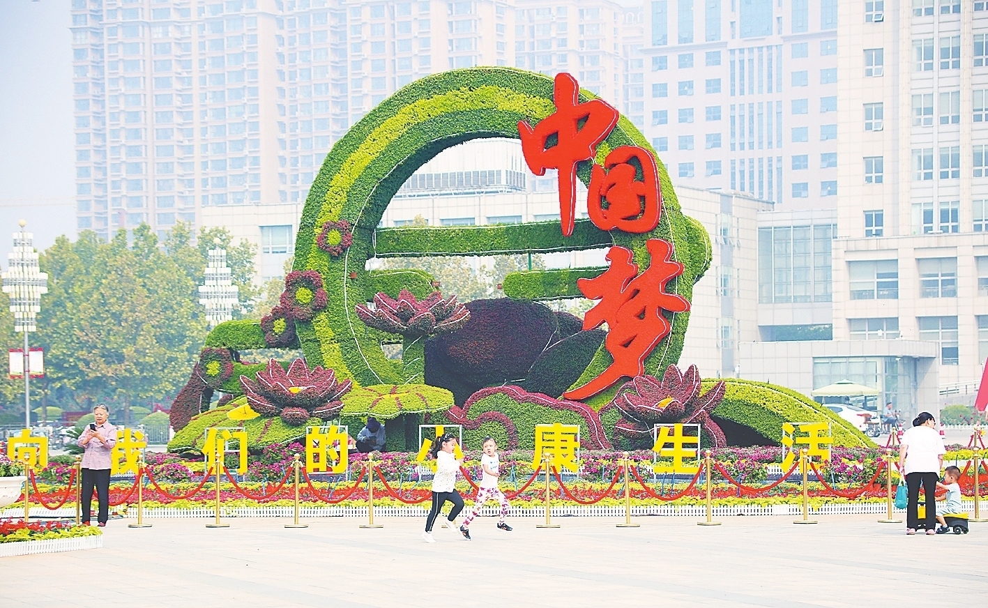 为营造喜庆祥和的节日氛围,近日,衡水市对市区人民广场进行了精心设计和美化。高8.5米、长20米的大型双面绿雕以“中国梦”为主题,巨型红色大字与花卉汇集在一起,成为了一道靓丽的风景,吸引了众多市民驻足观赏或合影留念。图为孩子们正在人民广场绿雕前嬉戏。