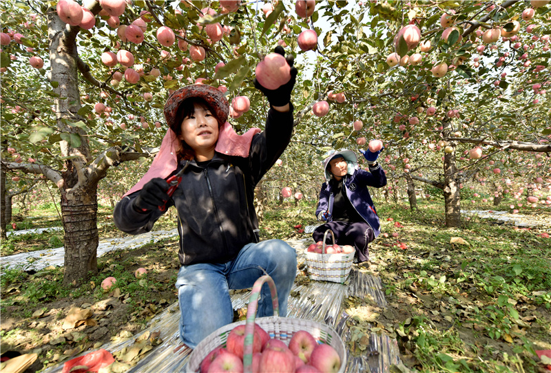 10月25日,河北省邢台市信都区宋家庄镇北店村果农在果园采摘苹果。 金秋时节,河北省邢台市信都区6.5万亩苹果进入收获季,果农们忙着采收苹果,供应市场。近年来,河北省邢台市信都区因地制宜调整农业产业结构,发展林果种植,带动农民增收致富。新华社记者 朱旭东 摄