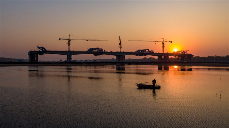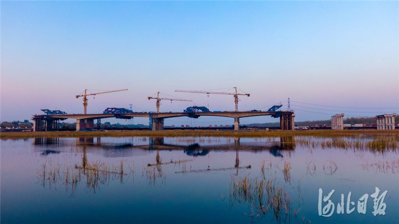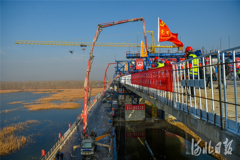 2020年11月24日,京德高速全线最大跨河连续梁—文安洼1号特大桥跨赵王新河连续梁顺利合龙,现场正在进行浇筑作业。河北日报记者赵杰摄影报道