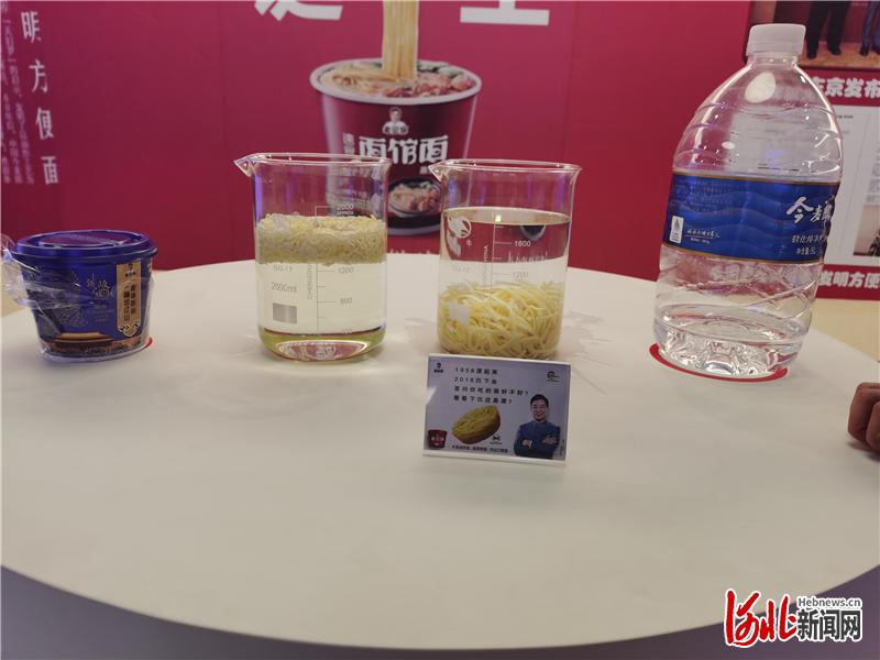 11月11日,在邢台市隆尧县今麦郎印象馆内,讲解员为记者现场演示了非油炸方便面与油炸方便面的区别——等量的常温饮用水同时浸泡,非油炸方便面会沉到水底。