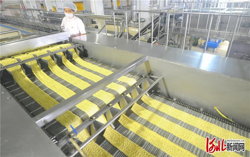 一家方便面生产企业内,员工正在车间查看蒸煮面带。 河北日报记者 杜柏桦摄