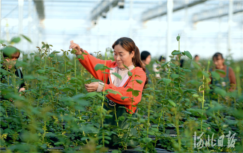 2020年11月20日,河北省邱县盛水湾生态产业集聚区玫瑰产业园内,工人正在温室大棚内管理玫瑰。河北日报记者杜柏桦摄影报道