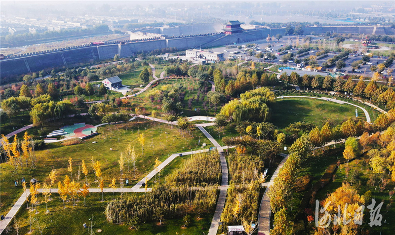 2020年11月13日拍摄的正定古城南城门及周汉河沿河绿带。 河北日报记者赵海江摄
