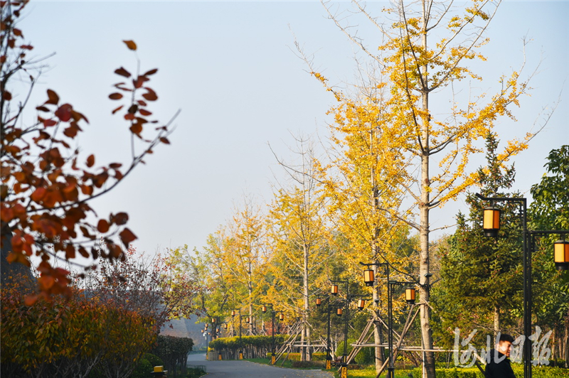 2020年11月13日,正定古城墙内侧绿道旁的银杏树。 河北日报记者赵海江摄