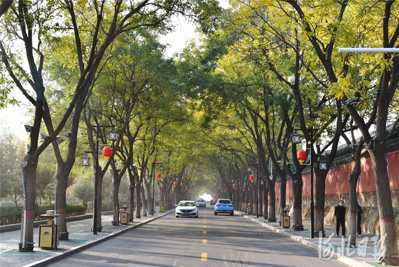 2020年11月13日,正定古城隆兴寺红墙外的林荫绿道。 河北日报记者赵海江摄