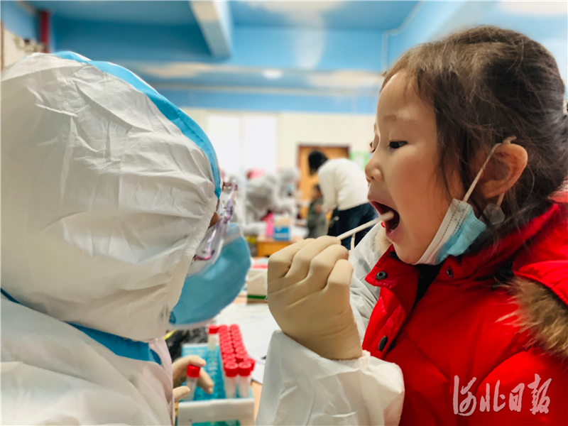 2021年1月7日,在河北省邢台市第四幼儿园,医务人员为幼儿进行核酸检测采样。据悉,河北省邢台市集中5.4万人的专业队伍,实行全员核酸检测,计划3天(1月8日)完成任务。同时对确诊病例和密接者采取“一人一方案”“一人一团队”的措施,对中风险地区实施全封闭管理。 通讯员 黄涛 摄影报道