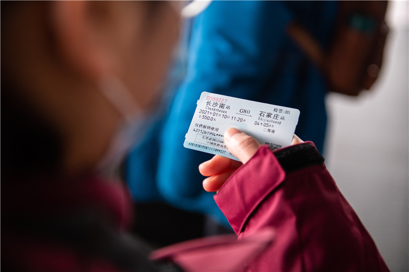1月10日,在长沙南站,医务人员在查看火车票信息。