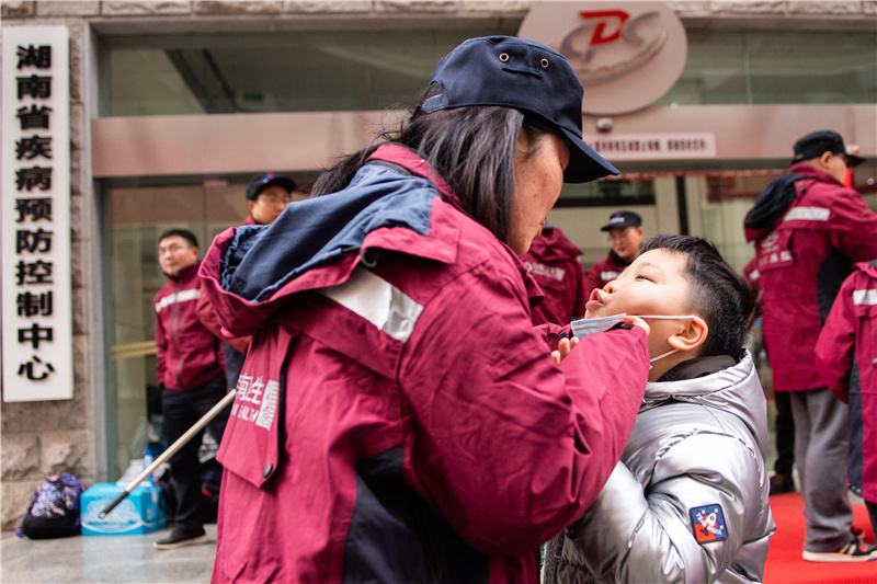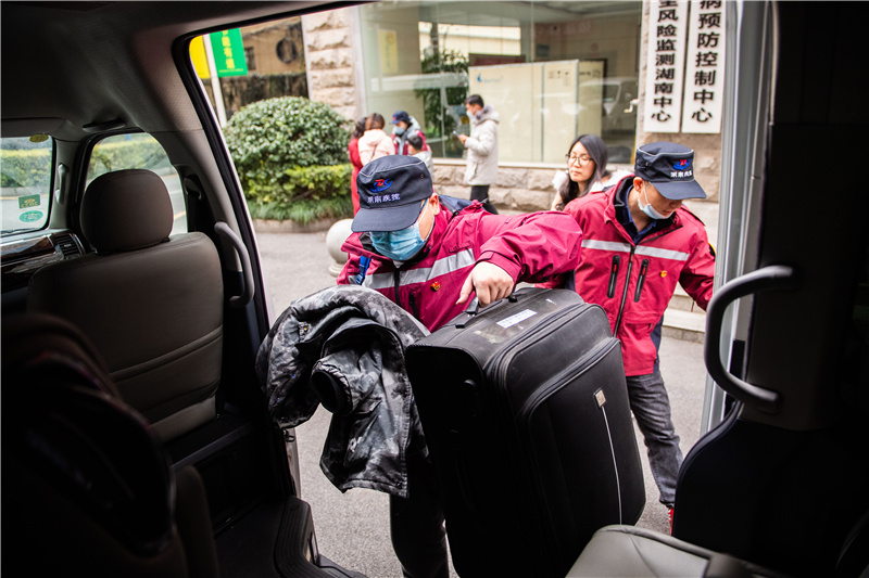 1月10日,在湖南省疾控中心,医务人员和亲友道别。