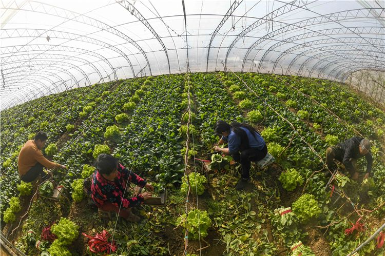 2月3日,河北唐山遵化市兴旺寨乡甘泽庄村农民在大棚收获油菜。