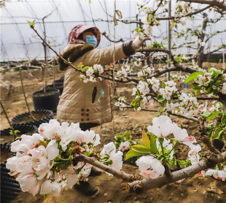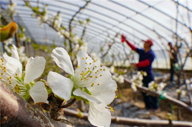 2月3日,河北唐山滦州市茨榆坨镇芦苇庄村农民为盛花期的樱桃树人工授粉。