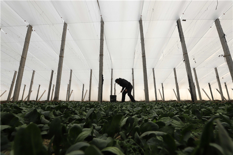 2月3日,河北省唐山市海港经济开发区王滩镇邓滩村的农民在大棚里管理菠菜秧苗。