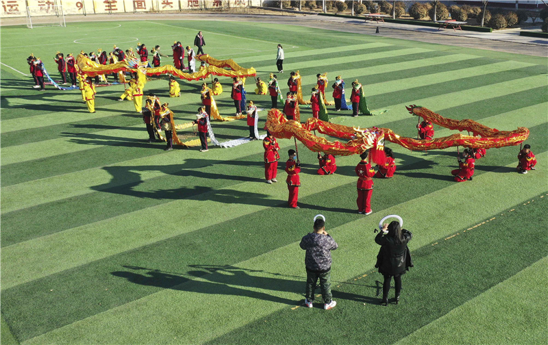 2月8日,河北唐山遵化市东旧寨镇梁屯中心小学的师生在录制舞龙节目,准备在春节期间播放(无人机照片)。