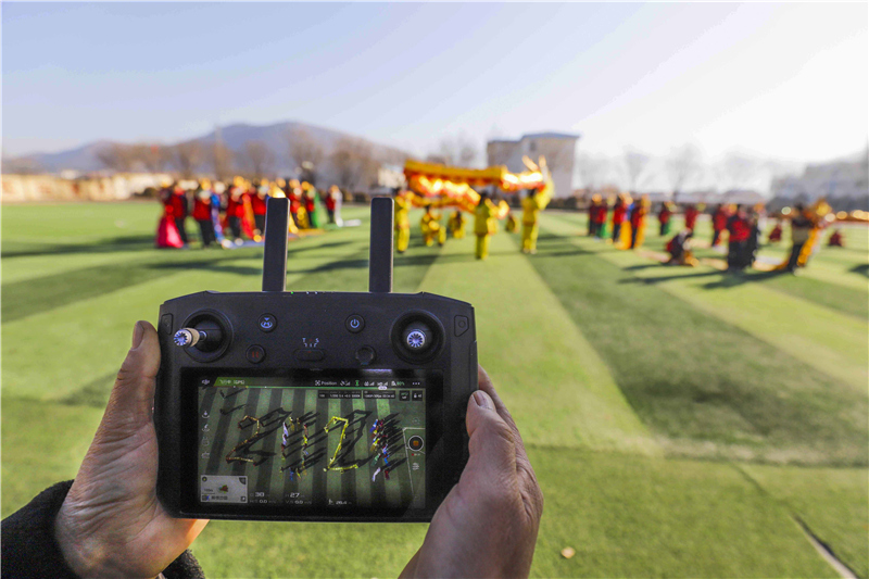 2月8日,河北唐山遵化市东旧寨镇梁屯中心小学的教师在用无人机录制舞龙民俗节目,准备在春节期间播放。