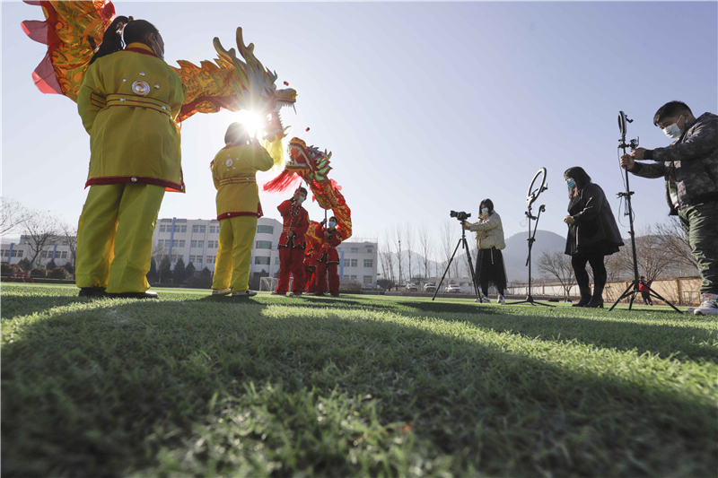 当日,河北唐山遵化市东旧寨镇梁屯中心小学的舞龙民俗节目正在紧张录制中。为了减少人员聚集又不减节日喜庆气氛,该校采取现场录制民俗节目视频、利用镇公众号在春节期间播放的形式,让人们在节日里感受到传统文化魅力。新华社发(刘满仓 摄)
