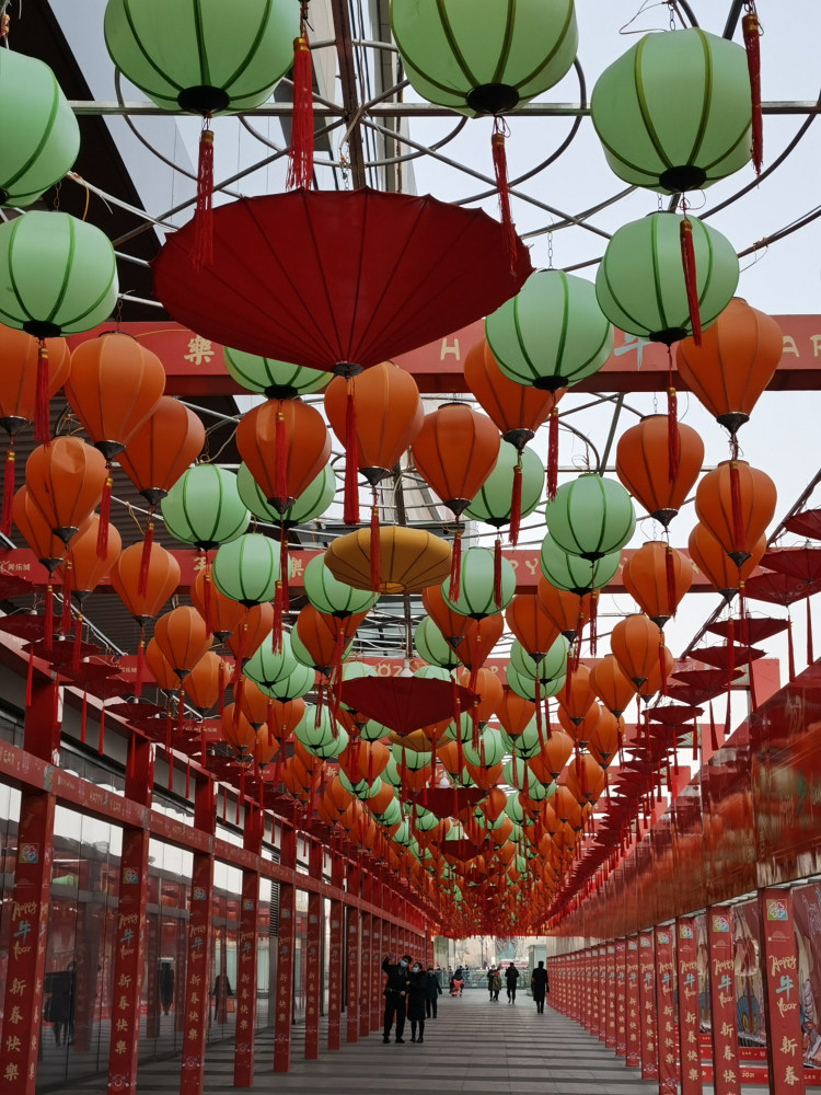 2021年2月16日,市民在百米吉祥彩色灯笼长廊下拍照留念。河北省邯郸市美乐城广场上设置的百米吉祥彩色灯笼长廊,为节日里的邯郸营造出浓浓的年味儿。河北日报通讯员张魁兴摄