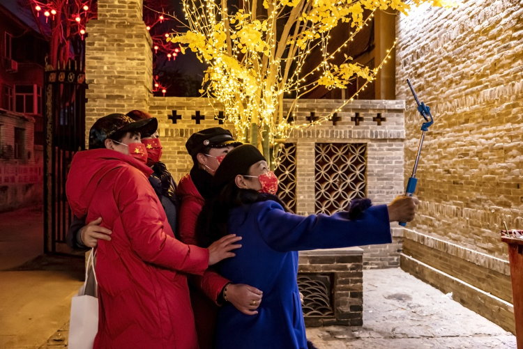 2021年2月15日晚,游客在河北省邯郸市著名的景点回车巷游玩。回车巷历史文化街区距今已有3100余年历史。2020年开始,邯郸市丛台区对其进行提升改造,以青黛砖瓦的战汉风格建筑群为主体原型,融入清末民初传统冀南民居建筑风貌。现在,回车巷成为邯郸市民和外地游客的网红打卡景点。河北日报通讯员聂长青摄
