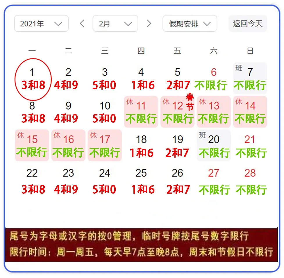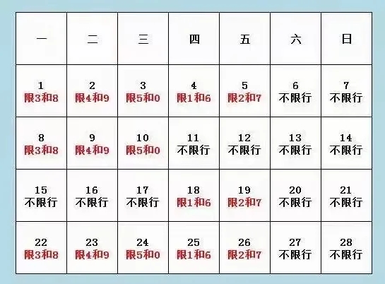 限行措施:车牌尾号为英文字母的以最后一位阿拉伯数字为准。(包括临时车牌,外地车也限行)