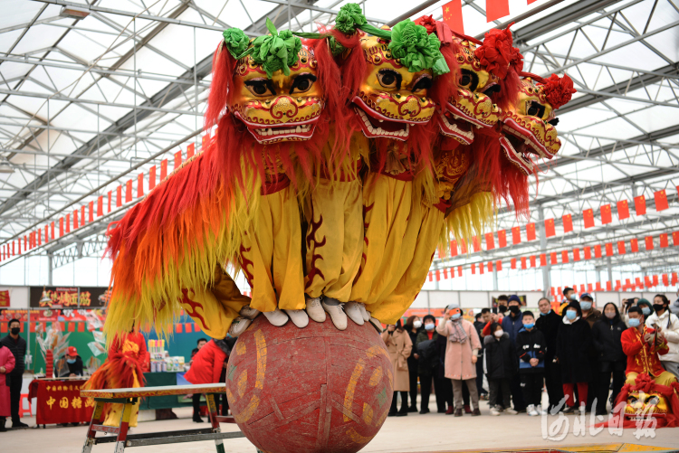 2021年2月24日,民俗表演队在河北省张家口市宣化区塔儿村乡窑子头村假日绿岛欢乐农场进行舞狮子表演。元宵节临近,河北省张家口市宣化区城乡进行多彩多姿的民俗表演,红红火火迎佳节。通讯员 陈晓东摄影报道