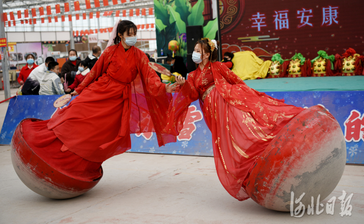 2021年2月24日,民俗表演队在河北省张家口市宣化区塔儿村乡窑子头村假日绿岛欢乐农场进行不倒翁舞蹈表演。