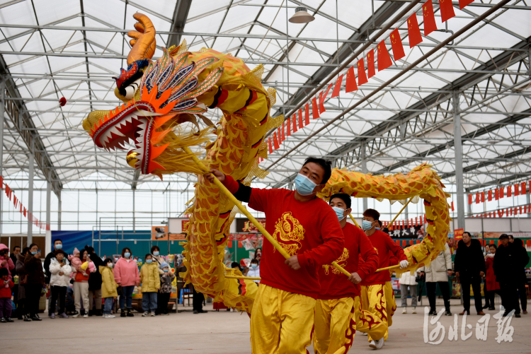 2021年2月24日,民俗表演队在河北省张家口市宣化区塔儿村乡窑子头村假日绿岛欢乐农场进行舞龙表演。