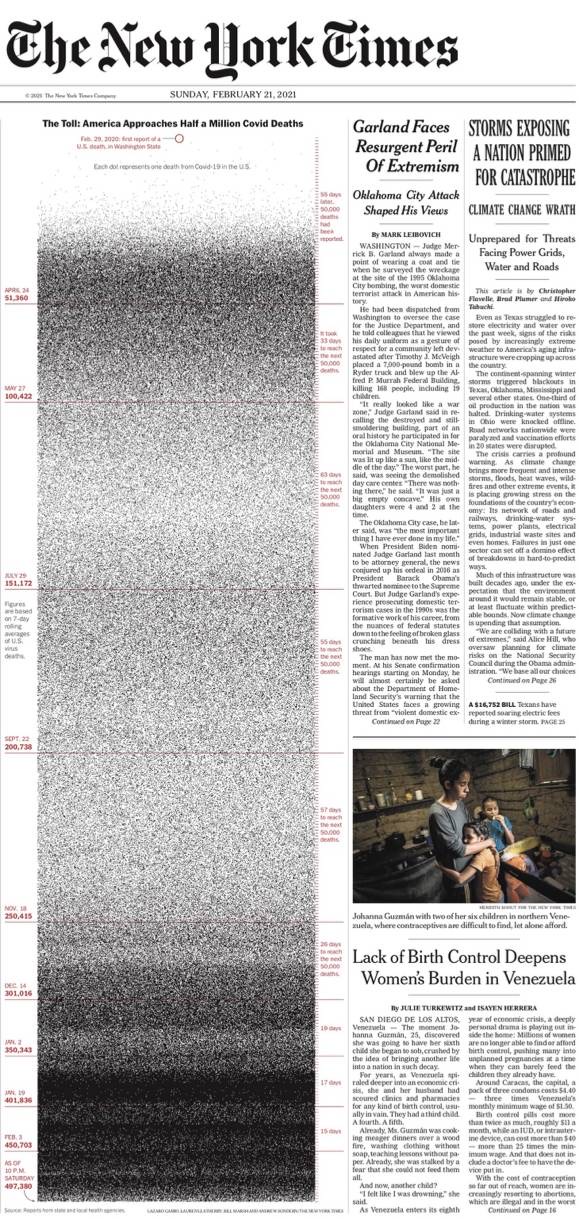 全美新冠死亡病例逼近50万例之际,美国《纽约时报》头版以巨幅点状图揭示了全美新冠疫情灾难:图表时间轴上,一个点代表一个在美国新冠病毒中逝去的生命。随着时间变化,分布得愈加紧密,代表了美国死亡病例增长速度的加快。从2020年2月29日报告第1个死亡病例至今,全美累计新冠确诊病例超2810万,死亡逾49.8万人。尽管美国每天通报的新增确诊病例数已大幅下滑,但每天仍有数千人死于新冠病毒。《纽约时报》的这个头版创意,引发了国际社会的广泛关注。