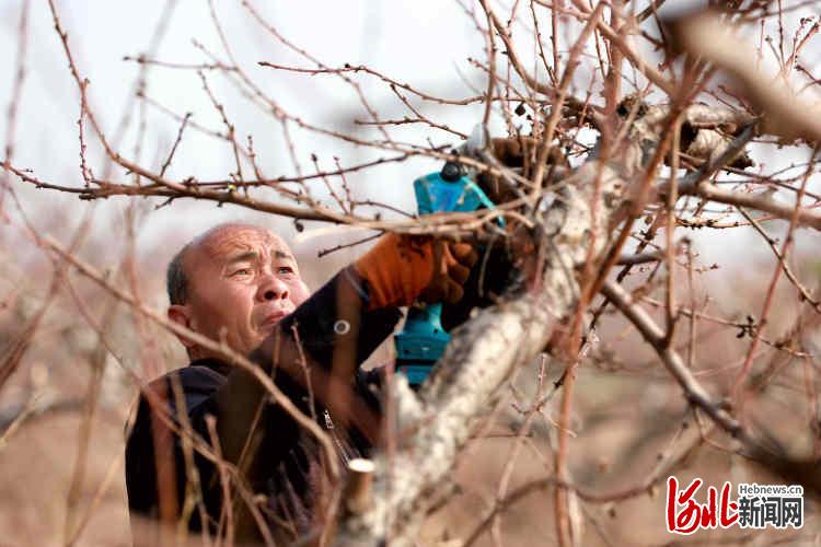 2021年3月3日,在河北省邢台市任泽区福林桃园里,果农在修剪枝条。通讯员 陈惠浩 摄影报道