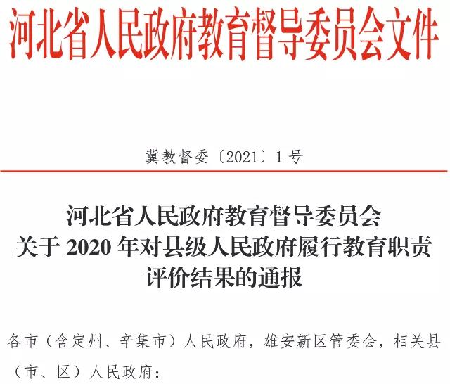 近日,河北省人民政府教育督导委员会最新发布关于2020年对县级人民政府履行教育职责评价结果的通报。2020年,省政府教育督导委员会办公室对47个县2016-2019年度政府履行教育职责情况进行了评价,对3个县2015-2018年度政府履行教育职责情况进行了回访。其中,47县评价结果为合格,2县回访结果为合格,1县回访结果不合格,对16个县予以通报表扬和奖励。