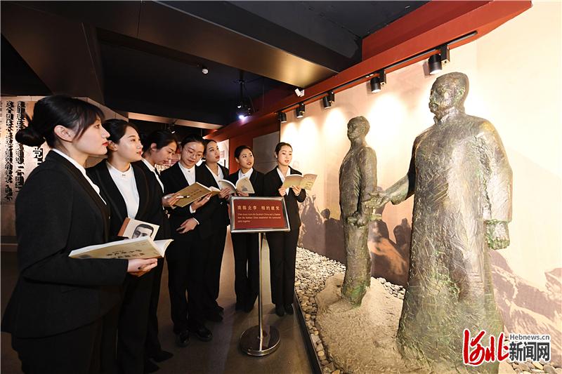 2月25日,李大钊纪念馆展厅内“南陈北李,相约建党”雕塑前,新入职的讲解员正在学习研究这一重大历史事件。通讯员 刘江涛摄