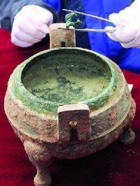 2010年11月,在陕西西安咸阳机场二期考古工地上,清理出一座距今2400多年的战国时期秦墓。在墓的壁龛中发现了一件青铜鼎、一件青铜钟和一件漆器残件。此鼎高20、腹径24.5厘米,有盖。更神奇的是,器物内竟然还有半鼎骨头汤。骨头经鉴定,被认定是狗骨,证明这是一锅狗肉汤,被趣称为“狗肉火锅”。