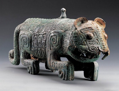 这个方形温鼎是1989年在江西新干大洋洲出土的,腹部各面饰有上下两层环柱角展体兽面纹,两旁纵向共目夔纹。纹饰线条宽平,图案简明,一侧宽面横开一口,口前置门,门可上下转动启合,还设置了用来固定闭门的插销。外底之上5.5厘米处的腹腔设有内底,内外底间形成夹层,起着炉灶的作用,在夹层里放上炭火,加热的温度虽不及柴火燃烧之高。也可以保持所盛食物常温不冷。